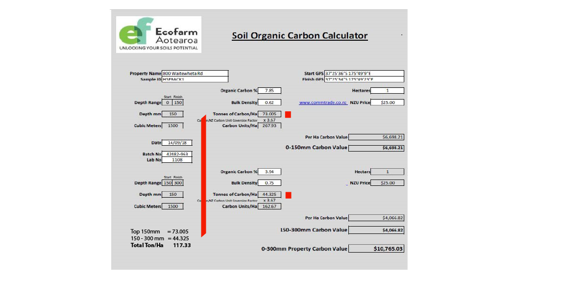 The Waitawheta calculator result above reports that 117.33 tons of soil organic carbon are held in the top 300mm of soil and that carbon, converted to NZ units has a value of $10,765.03 per Ha. In addition to the financial information reported on the carbon calculator the measurement and monitoring of soil organic carbon is important because the soil organic carbon trend is an important indicator of the health and functionality of the soil. Soil organic carbon plays a crucial role in the soil’s natural nitrogen cycle and the soil’s ability to hold water is very dependant on it.